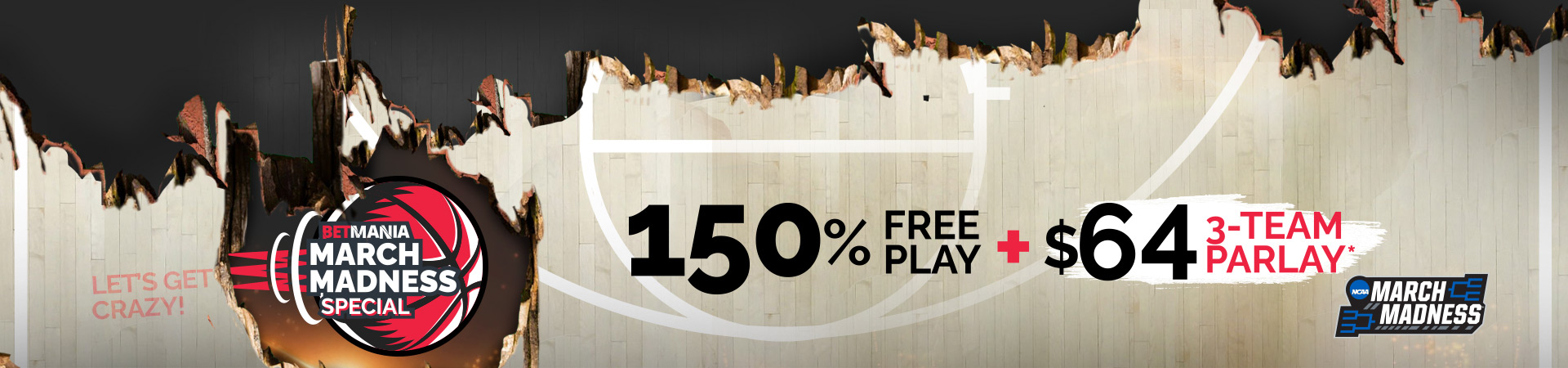 March Madness just got even more exciting at Betmania! Power up your plays with a 150% Free Play Bonus and score an additional $64 3-Team Parlay Free Play to stack your tournament tickets. More value, more action, and more chances to cash in on college hoops’ biggest stage.